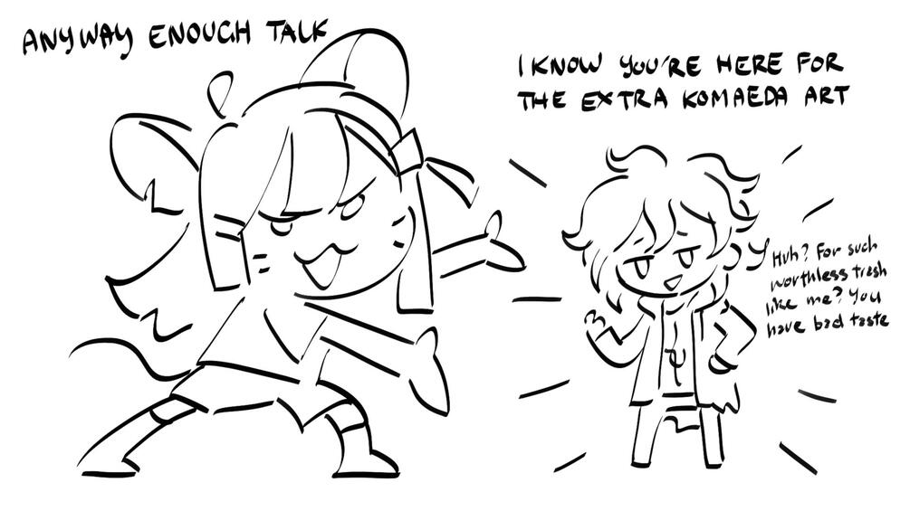 thank you for supporting my work! i put a lot of time and effort into my animatics and tho i dont draw them with profit in mind, youtube will not allow me to monetize them due to music copyright. i dont want anyone to feel pressured to purchase my pdf but i really do appreciate that kindness and i hope you enjoy the all the goodies! the pricing is a pay what you want system with 2usd being the minimum. all sales will go directly to my komaeda funds aha